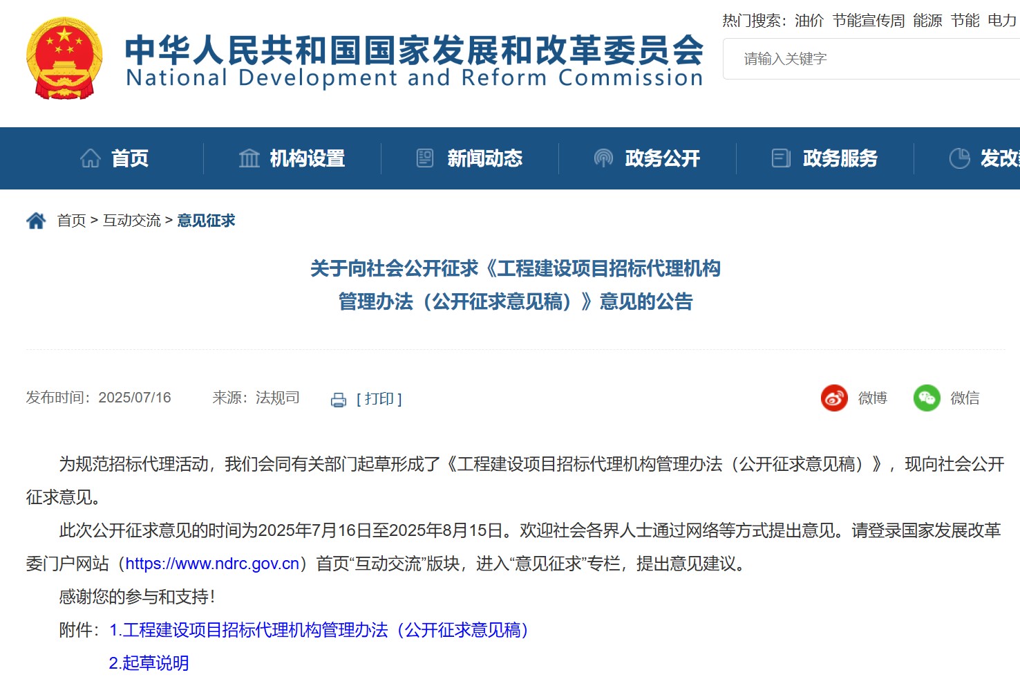 為規(guī)范招標(biāo)代理活動,國家發(fā)展和改革委員會會同有關(guān)部門起草形成了《工程建設(shè)項目招標(biāo)代理機構(gòu)管理辦法(公開征求意見稿)》,現(xiàn)向社會公開征求意見。此次公開征求意見的時間為2025年7月16日至2025年8月15日。